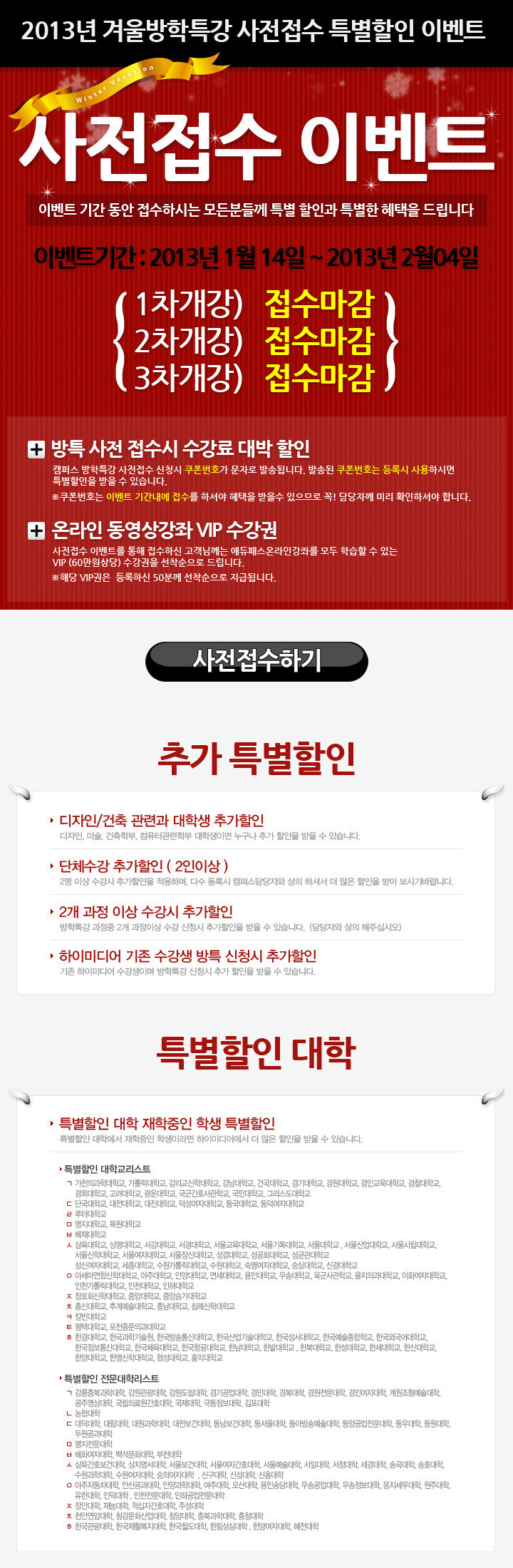 하이미디어 [종료] 겨울방학특강 사전접수이벤트 Post. 2012.11.20 겨울방학특강 사전접수이벤트 이벤트 기간내에 사전접수 하시면 할인쿠폰을 SMS문자로 받으 실 수 있습니다.