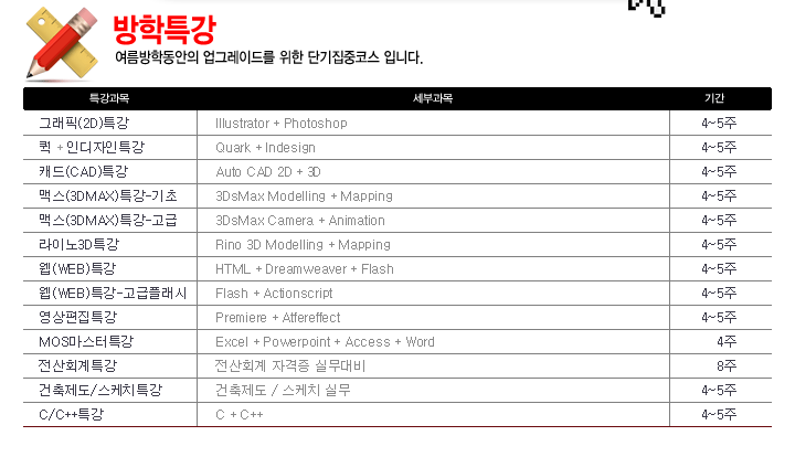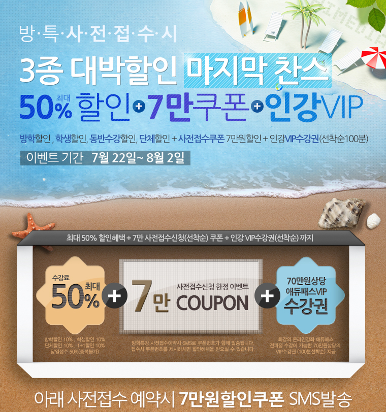 하이미디어 [이벤트]여름방학특강 사전접수 할인 이벤트 Post. 2013.05.29 여름방학특강 사전접수이벤트 이벤트 기간내에 사전접수 하시면 7만원 할인쿠폰(최대50%할인)를 SMS문자로 받으 실 수 있습니다.