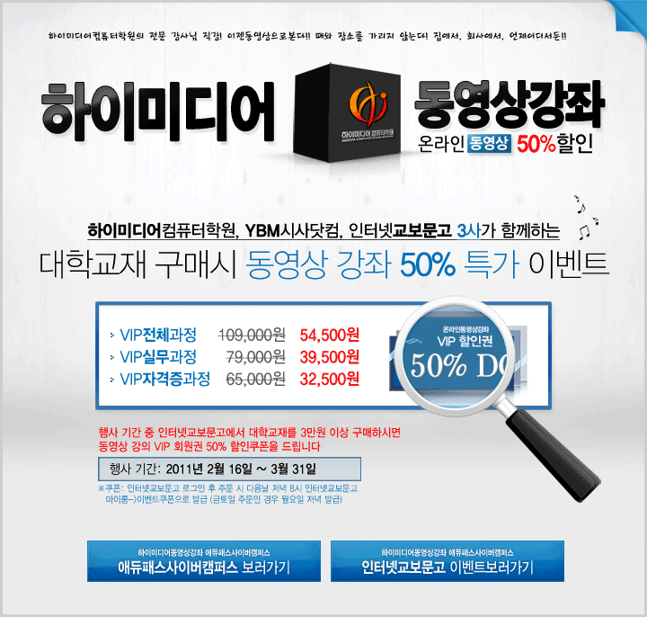 하이미디어 [종료] 동영상강좌 50% 특가 이벤트 Post. 2011.02.17 하이미디어컴퓨터학원, YBM시사닷컴, 인터넷교보문고 3사가 함께하는 대학교재 구매시 동영상 강좌 50% 특가 이벤트