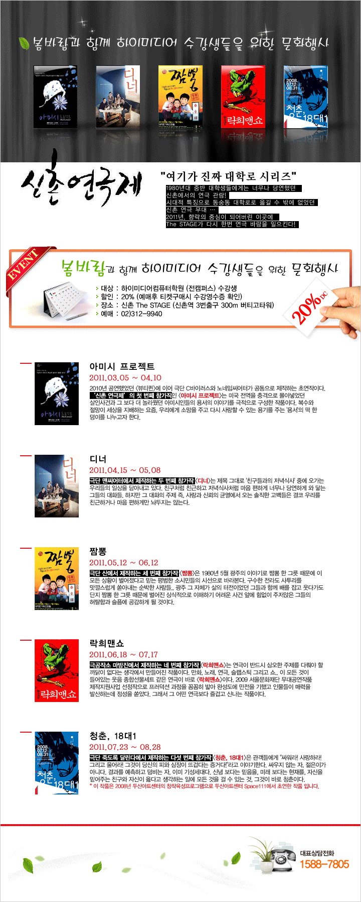 하이미디어 [행사] 봄바람과 함께 수강생들을 위한 문화행사 Post. 2011.02.22 <신촌 연극제>, 3월 5일 봄바람과 함께 온다 하이미디어 수강생이라면 누구나 특별할인 받고 공연 관람할 수 있습니다.