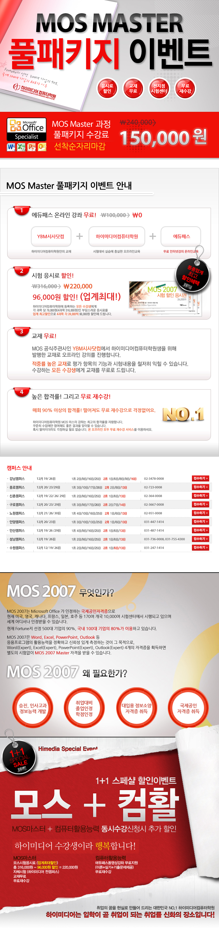 하이미디어 [종료] MOS마스터 풀패키지 이벤트 Post. 2011.12.01 MOS마스터 풀패키지 이벤트 1) 수강료 대박할인 2) 응시료 할인 (업계최고할인) 3) 온라인동영상강좌 무료지원 4) 불합격시 무료 재수강
